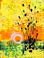 De basis voor dit werk is een monotype of monoprint gemaakt met een gelliplate en acrylverf. Een uniek handgemaakt en eenmalig werk, er kan maar 1 afdruk worden gemaakt van je ontwerp. Door de grafische druktechniek en het gebruikte papier ontstaan er allerlei structuren en effecten. Dat maakt het interessant om naar te kijken. Het is eigenlijk een abstract werk met letters en structuren op de fluorescerend gele achtergrond, maar toch doet het denken aan wuivende rietpluimen aan de waterkant bij een warm oranje zonsopkomst. Het diepe zwart staat in sterk contrast met de witte cirkel en de zomerse kleuren van de verf.