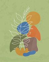 Minimalistische illustratie van een tak met bladeren in een abstract landschap. Het landschap is gemaakt van op elkaar gestapelde organische vormen, die staan voor: aarde, water, lucht, planten, bloemen en de zon.
