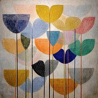 Een schilderij met abstracte natuurlijk bloemvormen die in lagen over elkaar zijn geplaatst. Elke vorm bestaat uit een halve cirkel of gestileerd blad, verbonden met een dunne rechte lijn als steel. De bloemen lijken te zweven in het beeld. De achtergrond is lichtgrijs beige met een subtiele structuur.