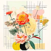 Grafische elementen, zoals lijnen, voegen een moderne twist toe aan het traditionele bloemstilleven.