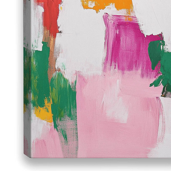 Een levendig abstract schilderij met krachtige penseelstreken en een mix van heldere kleuren, waaronder roze, groen, geel, rood, oranje, wit, magenta en paars. De achtergrond is wit, waardoor een contrast ontstaat tussen de zachte randen en de scherpe lijnen van de penseelstreken. Op sommige plekken, waar dikke lagen kleur een tactiel…