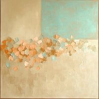 Abstract - Dit abstracte schilderij toont een verzameling van gescheurde, overlappende vormen in tinten van beige, blauw en goud, elegant gerangschikt tegen een zacht beige en lichtblauwe achtergrond, wat een indruk geeft van vallende bloemblaadjes of zwevende fragmenten.