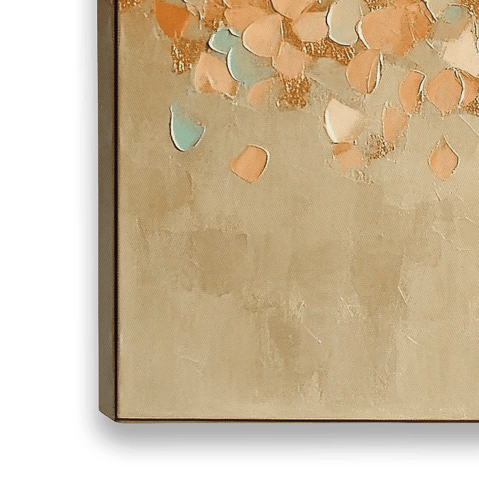Abstract - Dit abstracte schilderij toont een verzameling van gescheurde, overlappende vormen in tinten van beige, blauw en goud, elegant gerangschikt tegen een zacht beige en lichtblauwe achtergrond, wat een indruk geeft van vallende bloemblaadjes of zwevende fragmenten.