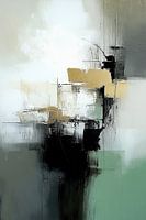 Abstract - Dit abstracte schilderij toont een gevlekte compositie van overlappende vlakken en texturen in aardse en neutrale tonen, versterkt door het contrast van donker en licht voor een diepe, ruimtelijke indruk.