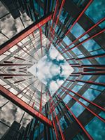 Deze foto toont een moderne architectuur in Almere, waarbij lijnen, vormen en kleuren samenkomen in een abstract en symmetrisch beeld. Door de spiegeling ontstaat een krachtig patroon waarin de rode en blauwe gevels elkaar kruisen en het oog automatisch naar het midden van de compositie wordt geleid.