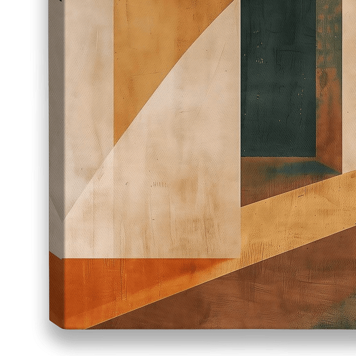Een minimalistisch en abstract kunstwerk dat geometrische vormen en architectonische elementen combineert. De compositie bestaat uit lagen van gedempte aarde- en terracotta-tinten, gecontrasteerd met diepe groen-grijze en crèmekleuren. De krachtige bogen en hoekige vlakken creëren een gevoel van diepte en ruimte. Dit werk heeft een…