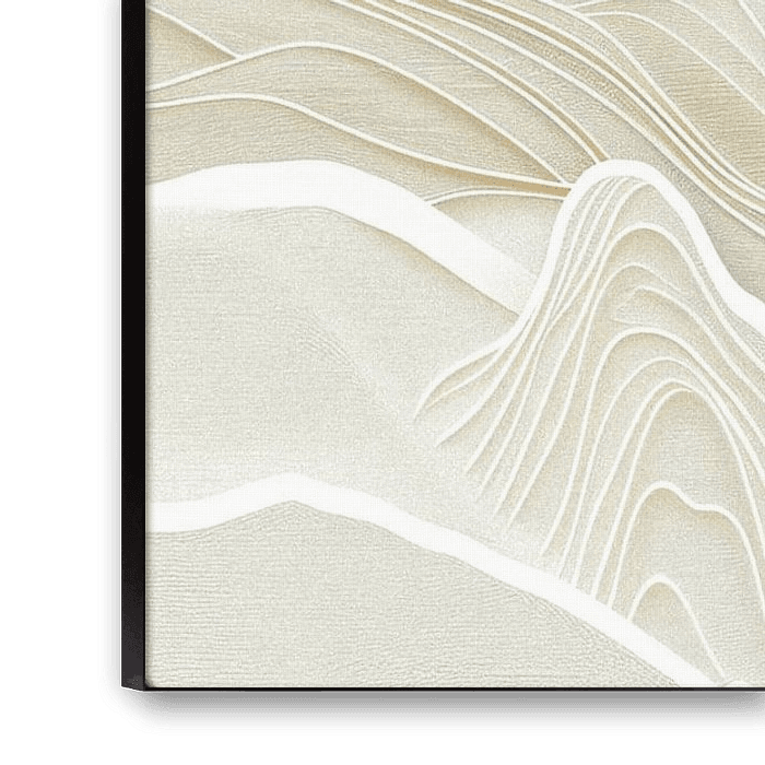 Deze afbeelding toont een abstract berglandschap, uitgevoerd in subtiele beige tinten met delicate witte lijnen. De combinatie van textuur en kleur creëert een verfijnde en serene uitstraling, perfect voor moderne en rustgevende interieurs. Het kunstwerk straalt een gevoel van diepte en beweging uit, waardoor het een fascinerend middelpunt vormt in elke ruimte. Ideaal voor woonkamers, slaapkamers, of kantoorruimtes, voegt dit kunstwerk een vleugje natuurlijke elegantie toe aan uw decoratie.