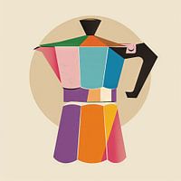 Dit dynamische kunstwerk toont een iconische Bialetti espressopot in levendige, geometrische kleurblokken. De gedurfde, contrasterende kleuren en strakke lijnen brengen energie en vreugde in elke kamer. Perfect voor moderne keukens en cafés, deze illustratie past naadloos in de hedendaagse inrichting en trekt ieders aandacht. Ideaal voor liefhebbers van pop-art en geometrische abstractie.