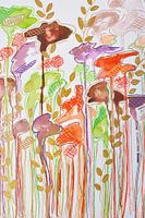 Tussen de kleurvlakken zijn grafische patronen en rasterachtige structuren zichtbaar, die een intrigerend contrast vormen met de zachte aquarelachtige overgangen. Deze patronen voegen een ritmische, bijna muzikale dimensie toe aan het werk — alsof de natuur hier niet alleen groeit, maar ook zingt.