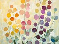 Abstracte Bloemen Dans - Dit is een abstract schilderij met gestileerde bloemen weergegeven als kleurrijke, ronde vormen op langgerekte, zachte groene stelen tegen een lichtgekleurde achtergrond, waardoor een levendige, speelse indruk ontstaat.