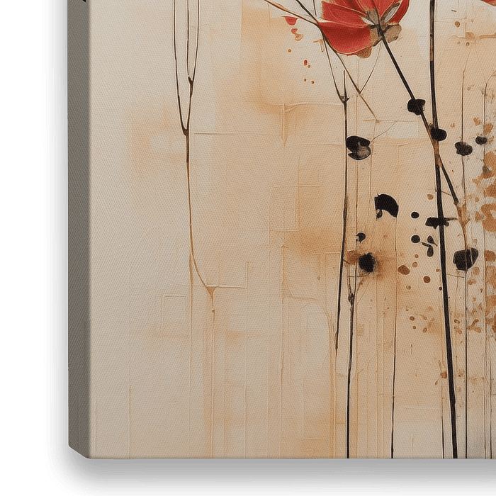 Dit schilderij betovert de kijker met een delicate symfonie van kleuren en vormen. Op een rustgevende achtergrond, die zich in een subtiel palet van zacht roze, wit en beige ontvouwt, dansen bloemen in een betoverende compositie. De bloemblaadjes stralen een warme gloed uit, variërend van goud, zachtroze tot zachtoranje, als een…