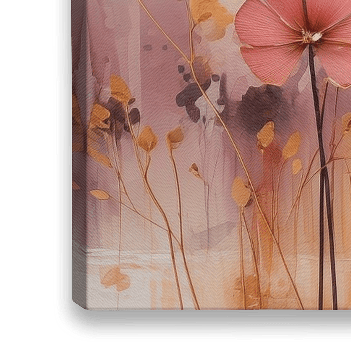 Dit schilderij betovert de kijker met een delicate symfonie van kleuren en vormen. Op een rustgevende achtergrond, die zich in een subtiel palet van zacht roze, wit en beige ontvouwt, dansen bloemen in een betoverende compositie. De bloemblaadjes stralen een warme gloed uit, variërend van zachtroze tot zachtoranje, als een levendige…