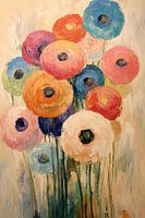Abstracte Bloemen in Pasteltinten - Dit is een abstract bloemenschilderij waar je een collectie van levendige, kleurrijke bloemen ziet die als dikke cirkels met donkere centra zijn geschilderd tegen een neutrale achtergrond met ruwe penseelstreken.