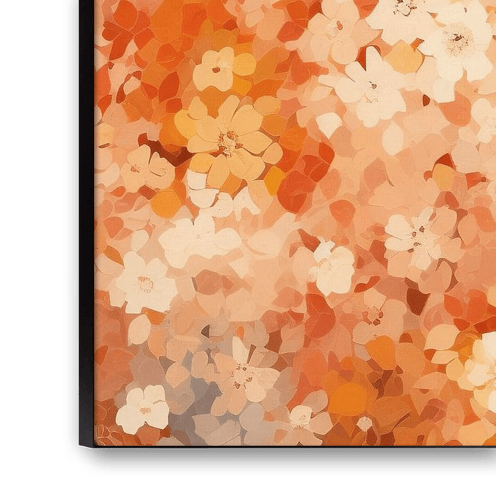 Abstracte Bloemen - Het schilderij toont een impressionistische weergave van bloesem in warme tonen, met een overvloed aan de kleur Peach Fuzz die een zachte en uitnodigende sfeer creëert. Het gebruik van licht en schaduw geeft diepte aan de afgebeelde bloemen, terwijl de abstracte stijl een hedendaagse touch geeft.