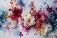 Een expressieve compositie van bloemen in wit, roze en bordeaux, omlijst door vloeiende verfstromen en schilderachtige details. Dit kunstwerk geeft energie en elegantie aan Eclectische, Bohemian en Modern Chic interieurs en brengt kleur in woonkamer, slaapkamer of eetkamer. Als een poëtische explosie van natuur en verf verbeeldt het de schoonheid van bloei en vergankelijkheid.