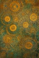 Dit werk toont een complexe compositie van cirkelvormige patronen in warme aardetinten. De verschillende structuren en lijnen binnen de cirkels geven het werk een dynamisch en textuurrijk karakter. De combinatie van goudachtige en groenige tinten zorgt voor een rustgevend effect, terwijl de abstracte vormen de verbeelding prikkelen. Dit werk past perfect in een interieur waar zowel rust als een vleugje mysterie gewenst is, bijvoorbeeld in een studeerkamer of een creatieve werkruimte.