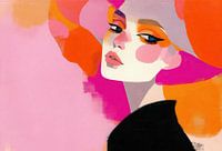 Abstracte Damesgezicht - Dit is een vrouwenschilderij waarop een gestileerd vrouwengezicht te zien is, omringd door zachte en abstracte vormen in opvallende roze, oranje en paarse tinten.