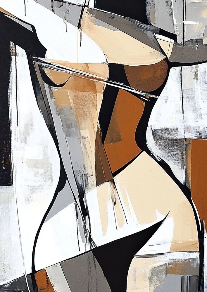 Abstracte Dans - Dit abstracte schilderij toont een gestileerde menselijke figuur in een dans van grijze, zwarte, havanna en witte vlakken en lijnen, die het beeld een dynamisch en modern karakter verlenen.