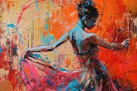 Details: danseres, urban, energie, beweging, ritme, abstract, vrouw, oranje, blauw, zwart, Pop of Colour