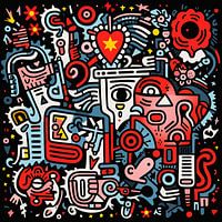 Dit is een kleurrijke abstracte doodle kunst met verschillende vormen en objecten. De afbeelding heeft een zwarte achtergrond en rode, blauwe, gele en witte kleuren. De objecten zijn onder andere gezichten, bloemen, harten en muziekinstrumenten.