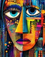 Dit schilderij is een levendig, abstract portret dat wordt gekenmerkt door een samensmelting van felle kleuren, geometrische vormen en patronen. Het gezicht is in tweeën gedeeld, waarbij elke helft verschillende kleuren en texturen gebruikt om contrast te creëren. De grote, expressieve ogen zijn prominent aanwezig en trekken meteen de aandacht, met lange, opvallende wimpers en intens blauwe irissen. De rest van het gezicht bestaat uit een dynamisch spel van stippen, lijnen en blokken, variërend van fel oranje, geel, blauw en paars, tot meer verzadigde tinten.