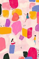 Abstracte Figuren - In dit abstract schilderij zie je twee figuren, een vrouw in een groene outfit en een andere figuur, die omringd zijn door vrolijke, kleurrijke vormen in onder andere roze, geel en paars op een zachte achtergrond.