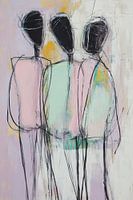 Abstracte Figuren - Op dit abstract schilderij zie je drie figuren met zwarte hoofden en gekleurde lichaamsaccenten in pastelkleuren zoals lichtgroen en roze, tegen een zachte paarse achtergrond.