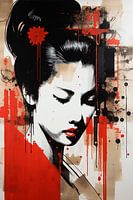 De samenstelling, vakkundig gecreëerd met diverse printmaking technieken, vangt de essentie van de geisha op een unieke manier. Delicate lijnen en zorgvuldig geplaatste vormen werken samen om een harmonieus geheel te vormen, waarbij de verfijning van de geisha wordt geaccentueerd zonder afbreuk te doen aan de moderne abstractie.