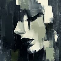 De kleurenpalet bestaat uit koele, gedempte tinten van grijs, groen en zwart, wat een gevoel van rust en introspectie oproept. De penseelstreken zijn zichtbaar en dragen bij aan de textuur en diepte van het werk, wat het een tactiele kwaliteit geeft. De abstracte achtergrond, met zijn onregelmatige blokken en lijnen, creëert een dynamische contrast met de gladde, organische vormen van het gezicht.