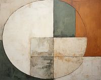 Abstracte Geometrie | Geometrische Rust - Het schilderij toont een abstracte compositie van geometrische vormen in een evenwichtig spel van cirkels en blokken. De kleurstelling is ingetogen met nuances van crème, groen, en terra, verlevendigd door textuur die diepte toevoegt aan de vlakken.