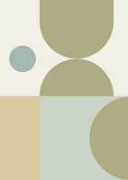Abstract geometrisch Japandi kunstwerk met boog en cirkel in groen, beige, ivoor, gebroken wit, Scandinavisch blauw en saliegroen op een ivoorkleurige achtergrond.