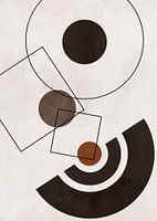 Grafische illustratie met abstracte vormen in donkerbruin, bruin en rood op een taupe gekleurde achtergrond en overlappende cirkels en vierkanten in zwart getekend. Dit modern geometrisch kunstwerk in Scandinavische stijl is een mooie toevoeging voor elk interieur.