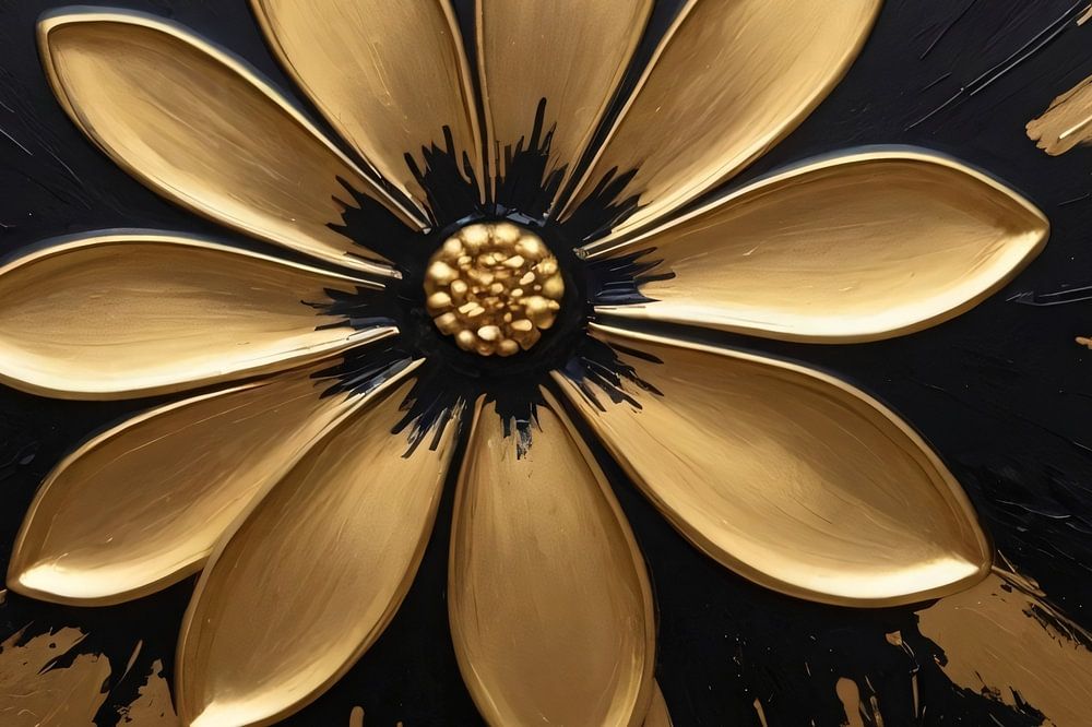 Dit prachtige kunstwerk straalt luxe en elegantie uit met zijn eenvoudige maar krachtige voorstelling van een bloem. De gouden tinten schitteren op het diepzwarte doek, waardoor een dynamisch contrast ontstaat dat in elke kamer een statement maakt. Of het nu in een moderne woonkamer hangt of een klassieke hal siert, het stuk trekt onmiddellijk de aandacht. De abstracte bloemvorm en de spatten van goud verrijken de textuur en diepte van het schilderij. Het is een tijdloos stuk dat zowel de liefhebbers van moderne als klassieke kunst zal aanspreken, en het past bij diverse interieurstijlen.