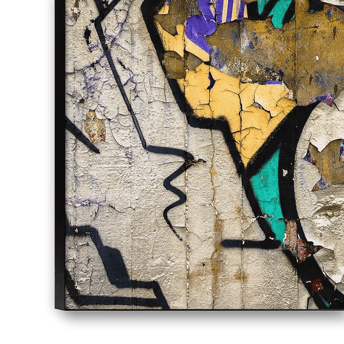 Deze close-up toont een verweerde betonwand waar street-art en tijdspatina elkaar kruisen. Gebarende zwarte contouren, scheuren, bladders en kleurvlakken creëren diepte en ritme. Perfect voor interieurs met een industriële, creatieve of moderne sfeer die houden van textuur en karakter.