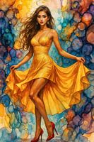 Dit schilderij toont een elegante vrouw in een vloeiende, felgele jurk, die een klassieke pose aanneemt alsof ze danst of in beweging is. Haar lange, donkere haar waait lichtjes. Ze draagt rode hakken en subtiele oorbellen. De achtergrond is een levendige mix van Aquarelachtige vlekken in alcoholinkt-techniek in de kleuren blauw, oranje en gele tinten, wat een dromerige en artistieke sfeer creëert. De achtergrond kleuren vullen de gele jurk van de vrouw aan waardoor er een harmonieus en dynamisch geheel ontstaat.