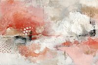 Abstract schilderij in perzikroze, warm oranje en crème met zachte lagen, stippen en structuren. “Abstracte Horizon - Zachte Lagen” brengt ritme, diepte en een poëtische balans in elk interieur.
