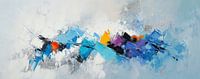 Abstracte Kleurenmix - Dit is een abstract schilderij met dynamische vormen in verschillende tinten blauw en opvallende kleuren zoals geel, oranje en paars, wat zorgt voor een levendige uitstraling.