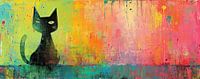 Abstracte Kleurrijke Kat - Dit speelse, abstracte kunstwerk zou een vleugje karakter toevoegen aan elke moderne ruimte. Een silhouet van een kat tegen een achtergrond van heldere, gestreepte kleuren brengt een onverwachte draai aan de traditionele dierenkunst, terwijl de rijke textuur en de spatten van neonroze en geel energie en levendigheid toevoegen.