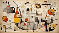 Dit levendige kunstwerk is een dynamische compositie vol fantasierijke figuren, sterk beïnvloed door de surrealistische stijl van Joan Miró. De schilderachtige achtergrond van lichtbruin en zandkleurige tinten creëert een dromerige, open ruimte waarin een parade van abstracte wezens tot leven komt. De figuren zijn een mix van strakke geometrische vormen, gebogen lijnen en expressieve, kleurrijke vlakken, wat een speelse en energieke sfeer oproept.
