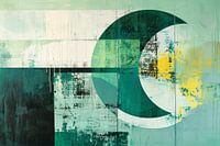 Centraal staat een grote cirkelvorm die doet denken aan een maan, half verborgen achter overlappende vierkanten en rechthoeken. De achtergrond is een rustige collage van mintgroene, witte en donkerblauwe vlakken, doorspekt met vegen en druppels in contrasterende geel en zwart. De verf is op sommige plaatsen dik aangebracht en elders weer subtiel uitgesmeerd, wat de indruk wekt van een muur die vele levens en verhalen heeft gezien. Het geheel straalt een kalme, contemplatieve sfeer uit en nodigt de kijker uit tot introspectie en rust.
