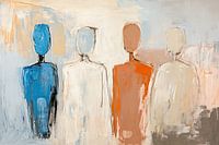 Abstracte Mensen Kleuren - In dit abstract schilderij zie je vier menselijke figuren in verschillende kleuren, met een opvallende blauwe figuur aan de linkerkant en een oranje figuur rechts, tegen een zachte, neutrale achtergrond.
