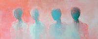 Abstracte Mensen | Silhouetten Mensen - Op dit abstract schilderij zie je vier silhouetten van mensen in pastelkleuren, waarbij voornamelijk zachte tinten roze en turquoise de aandacht trekken en een dromerige sfeer creëren.