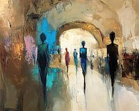 Abstracte Mensen - Op dit abstract schilderij zie je langwerpige silhouetten van mensen in verschillende kleuren, die door een ruimte met een lichtbruine achtergrond wandelen, terwijl opvallende blauwe en rode tinten een speelse sfeer toevoegen aan de compositie.