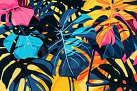 Deze kunstdruk toont monsterabladeren in een abstracte en kleurrijke compositie. De levendige roze, oranje en blauwe tinten geven het kunstwerk energie en creativiteit. De dynamische opstelling van de bladeren en het kundige gebruik van kleuren en texturen geven deze print een expressieve en moderne uitstraling. Dit ontwerp is ideaal…