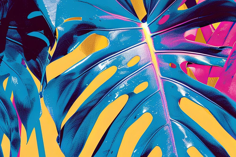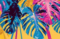 Deze kunstdruk toont monsterabladeren in een abstracte en kleurrijke compositie. De levendige roze, oranje en blauwe tinten geven het kunstwerk energie en creativiteit. De dynamische opstelling van de bladeren en het kundige gebruik van kleuren en texturen geven deze print een expressieve en moderne uitstraling. Dit ontwerp is ideaal voor residentiële of commerciële ruimtes die op zoek zijn naar een gedurfd accent en zal iedereen aanspreken die houdt van een artistieke en levendige sfeer in hun omgeving.