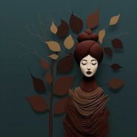 Een verstilde momentopname van vrouwelijke gratie en natuurlijke harmonie wordt weerspiegeld in deze abstracte afbeelding. Het vrouwenhoofd, gehuld in bladeren en takken, ademt een bedwelmende rust uit. Het kleurenpalet van bosgroen, warme bruinen en koele blauwen versterkt de mystieke sfeer.