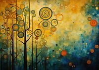 Abstracte Natuur - Dit schilderij toont een speels abstract landschap, waarin gestileerde bomen versierd zijn met cirkelvormige bladeren, op een achtergrond van overlappende kleurvlakken die een mozaïekachtig effect creëren. De warme goudgele en oranje tinten fuseren vloeiend met koelere blauw- en groenschakeringen, waardoor een…
