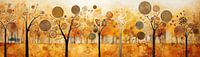 Abstracte Natuurkunst - Hier zien we een charmante abstracte interpretatie van een landschap, rijk aan organische vormen die wellicht bomen voorstellen. De harmonieuze aardetinten en goudgele kleuren creëren een verwelkomend en warm gevoel, terwijl de bijzondere texturen en cirkelvormige motieven zorgen voor een speelse doch verfijnde diepgang.