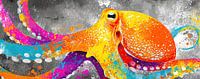 Abstracte Octopus in Oranje en Roze - Op dit dieren schilderij zie je een kleurrijke octopus met felle oranje, roze en blauwe tinten, omgeven door een abstracte achtergrond met grijze en witte vlekken.