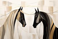 Een verfijnde en betoverende kunstcompositie die twee paarden in een minimalistische lijnstijl weergeeft, doordrenkt met een vintage waterverfpatroon van zwart en beige. De abstracte textuur en neutrale abstractie creëren een harmonieus contrast op een heldere witte achtergrond, geplaatst op een intrigerende tweekleurige achtergrond. Deze kunstwerken, geïnspireerd door de gotische popstijl, bevatten delicaat gouden detailing, waardoor een illusoir effect ontstaat als behang. De combinatie van donkere zwarte en beige tinten met geometrische vormen en patronen resulteert in een speelse, fantasierijke illustratie die perfect past in eigentijdse interieurs.